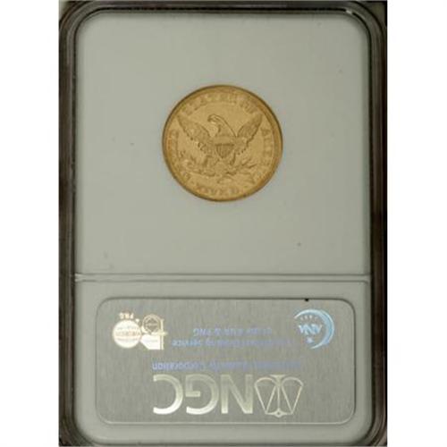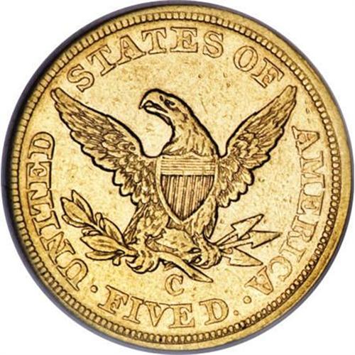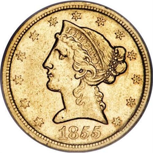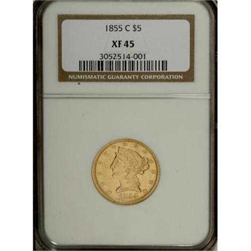 <B>1855-C $5 XF45 NGC.</B></I> Variety 23-J, the only known dies. Some faded luster is still present in the protected areas of this pretty Choice XF piece. There is only light chatter in the fields, and attractive yellow-gold coloration completes the lovely package. This is a historic example, made in one of the few years that there were five mints producing gold coinage.<BR><BR><B>Coin Engraver:</B> Christian Gobrecht<BR><BR><b>Shipping:</b> Coins & Currency (<a target="_blank" href="http://www.heritageauctions.com/common/shipping.php">view shipping information</a>)