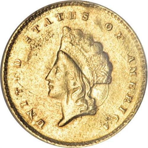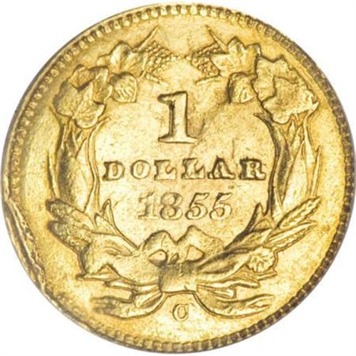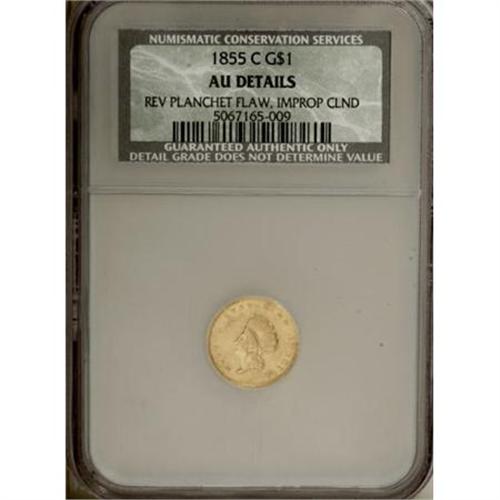 <B>1855-C G$1 --Reverse Planchet Flaw, Improperly Cleaned--NCS. AU Details.</B></I> Variety 9-K. The last 5 in the date is to the right below the A in DOLLAR, and all digits in the date are sharp on this variety. Bright yellow-gold surfaces reveal fine hairlines, and a couple of small, shallow planchet flaws are visible to the right of the 1 in the denomination. Still a partly lustrous survivor of this low mintage and devoutly collected issue.<BR><BR><B>Coin Engraver:</B> James B. Longacre<BR><BR><b>Shipping:</b> Coins & Currency (<a target="_blank" href="http://www.heritageauctions.com/common/shipping.php">view shipping information</a>)
