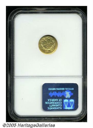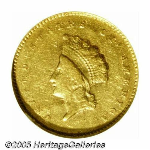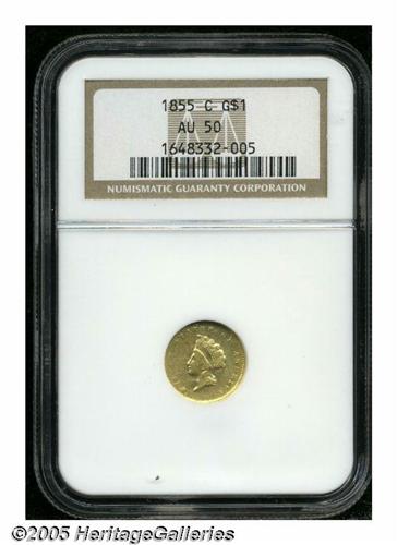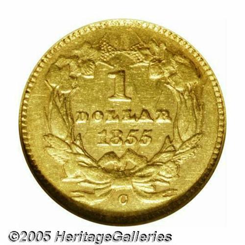 <B>1855-C<G$1> AU50 NGC.</B></I> Variety 9-K. Light yellow-gold with slight wear visible on both sides. A few minor imperfections are noted, including a light scratch on the obverse. This example was struck from tired dies with clash marks and noticeable die wear. As a result, the strike was not what it could have been, and the light wear appears heavier than it actually is. Just 9,803 examples were produced, and nearly all survivors show signs of considerable circulation.