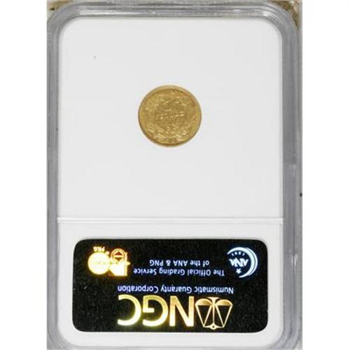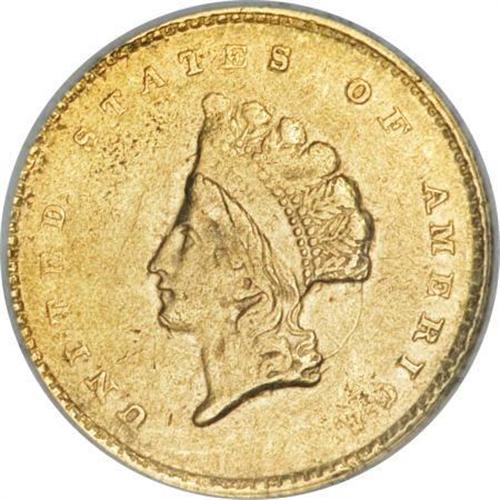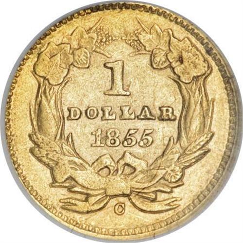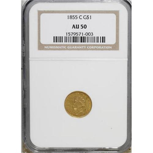 <B>1855-C G$1 AU50 NGC.</B></I> Variety 9-K. In his reference, Winter records one variety, although we have a record of two different reverse dies with a slight variance in date position. This example has the date shifted slightly right, and appears to be the more plentiful variety. This late die state piece has noticeable clash marks and die bulges, especially on the obverse, affecting the strike. The surfaces are pleasing green-gold with nearly full satin luster. Minor abrasions and other blemishes are evident on both sides.<BR><BR><B>Coin Engraver:</B> James B. Longacre<BR><BR><b>Shipping:</b> Coins & Currency (<a target="_blank" href="http://www.heritageauctions.com/common/shipping.php">view shipping information</a>)