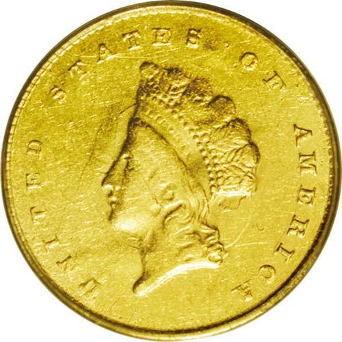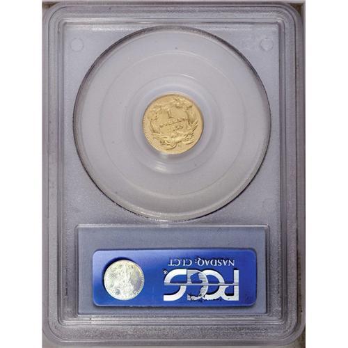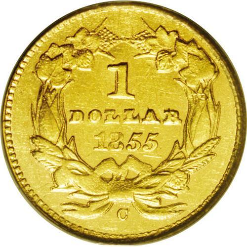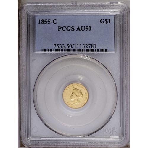 <B>1855-C<G$1> AU50 PCGS.</B></I> Variety 9-K. This has become an infamous date in the gold dollar series, as it happens to be the date of the most poorly made products from the Charlotte Mint. These coins suffer from a plethora of minting and planchet problems, one of the most noteworthy being the inherent weakness in the center of the reverse. This specimen exhibits better-than-average definition on the LL of DOLLAR, but typical weakness shows on the 8 of the date. Heavy die clash marks are noted on the obverse. A number of wispy hairlines and a few pinscratches are visible on both sides. Population: 19 in 50, 30 finer (4/06).