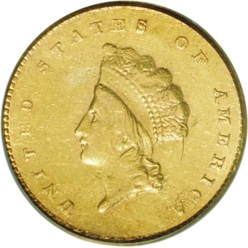 <B>1855-C G$1 AU50 PCGS.</B></I> Variety 9-K, with the final 5 in the date to the right of the A in DOLLAR, and the date sharply struck. Bright apricot-gold surfaces retain some luster, and reveal just a fewer minute contact marks, especially on the obverse. The design elements are well defined, with all of the letters in LIBERTY showing. Some softness is noted in Liberty's hair. The obverse is strongly clashed, and reveals what appears to be a die bulge in the field below Liberty's chin.<BR><I>From The Carolina Gold Collection, Part Two.</B></I>