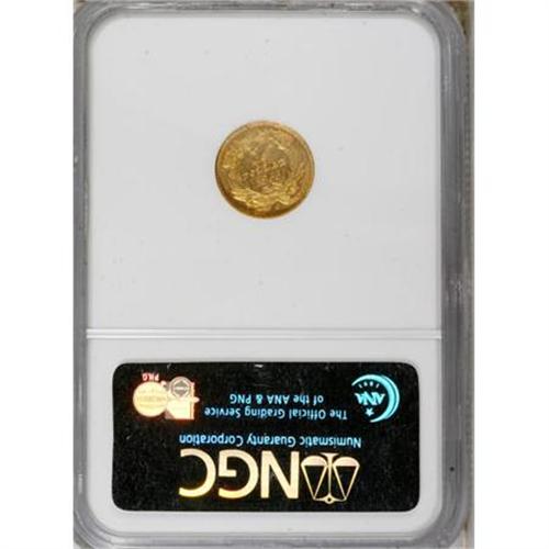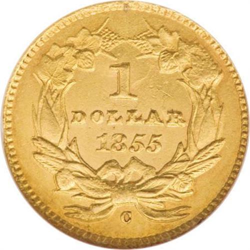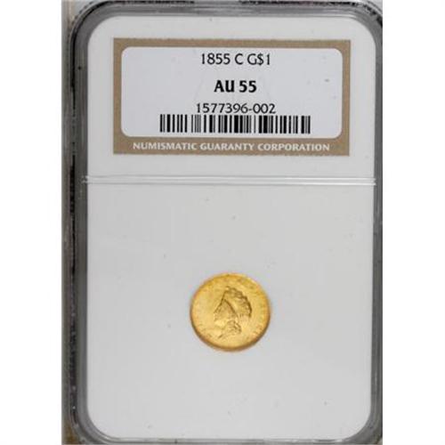<B>1855-C G$1 AU55 NGC.</B></I> Variety 9-K. Only 9,803 pieces were struck of the 1855-C gold dollar, and of that small number it is estimated that today a mere 100-110 examples are known in all grades. This piece is far above average for the issue in terms of overall preservation; however, it does show the usual planchet problems and heavy die clashing seen on most survivors. Notably, a planchet lamination is located in the upper left obverse field below AT, and there is planchet granularity through CA. The reverse is unusually well defined, while the obverse has the usual softness of strike this issue is known for. Lovely reddish patina is seen over each side.<BR><BR><B>Coin Engraver:</B> James B. Longacre<BR><BR><b>Shipping:</b> Coins & Currency (<a target="_blank" href="http://www.heritageauctions.com/common/shipping.php">view shipping information</a>)