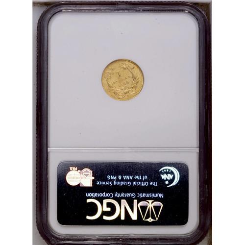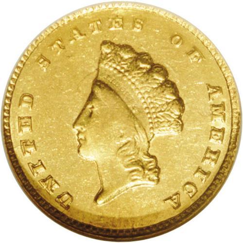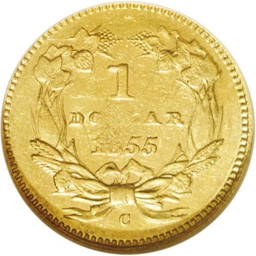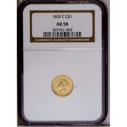 <B>1855-C<G$1> AU58 NGC.</B></I> Variety 9-K. Although only one variety was recorded in the literature, two different reverse dies are actually known. This example has the final 5 centered below A in DOLLAR. The other variety has the digit 5 right of center below the A. It is not known which variety might be scarcer. This is an extremely important opportunity for the advanced collector or type collector to acquire the only Charlotte Mint Type Two gold dollar. It is typical of all its peers, with weak details at the center of each side. Considerable luster remains visible with bright greenish-gold coloration. Moderate to heavy clash marks are visible on both sides. The central area of the reverse is extremely weak with numerous planchet abrasions from metal that was not actually struck by the die. <BR><BR><B>Important notice:</B> Heritage usually auctions material at the rate of 200-250 lots per hour. On some occasions eBay Live bid software or the Internet may not be able to keep up with the pace of the auction. We recommend placing a realistic absentee bid now as insurance to avoid disappointment. Occasionally the auctioneer may eliminate or reject an eBay Live bid, and the auctioneer may also reopen a lot after the close of the eBay live bidding (usually because we missed an audience bid), and may reject your bid even if it shows you as the winning bidder. By bidding via eBay Live, you agree that Heritage may award the lot to another bidder at its sole discretion under the circumstances described above or any other reasonable circumstances. Since eBay bids are not shown to us until we open the lot on the floor, we treat those bids just like floor bids. In most cases the floor responds before the eBay bid is presented to us, due to Internet lag time, so for consistency we have made it a policy that floor bids are always considered first over tie eBay live bids. Also please note that all Heritage lots purchased through eBay Live carry a 20% Buyer's Premium. Please make sure you read the Terms and Conditions before you bid. This lot is being auctioned in conjunction with a live floor auction by Heritage Galleries & Auctioneers. All final auction and invoice information will be supplied by Heritage Galleries & Auctioneers, and all other information should be considered preliminary. Lot:2286 <BR><BR><B>Winning Notification and Billing:</B> After the FINAL session in this auction is complete, Heritage will send e-mail and snail mail invoices. This process normally takes several days. All final auction and invoice information will be supplied by Heritage Galleries & Auctioneers, and all other information should be considered preliminary. <BR><BR>This auction will be conducted on a live auction floor and over the Internet through eBay Live. If you choose to place an absentee bid, please take a moment to <font color='#0000ff'><u><a href='http://pages.ebay.com/liveauctions/help/before/laabsentee.html'>learn how eBay Live absentee bidding works</a></u></font><font color='#000000'>