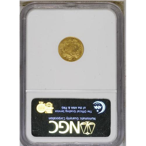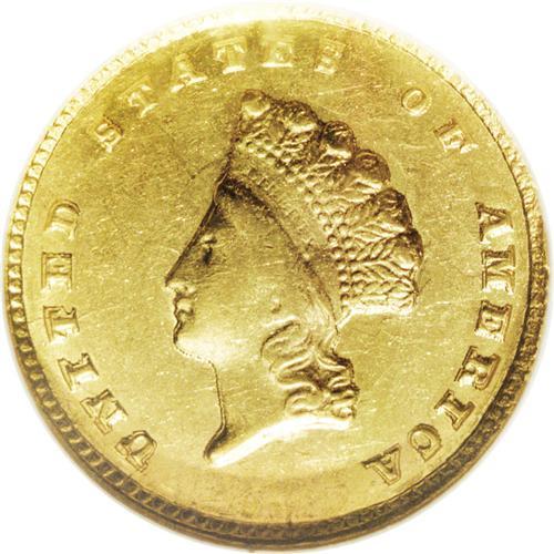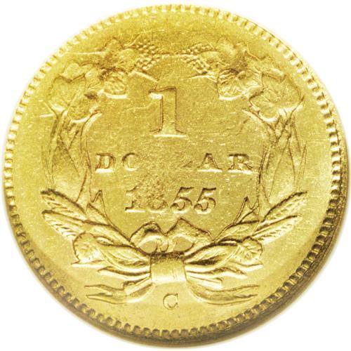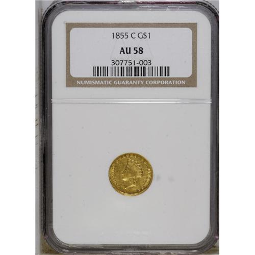 <B>1855-C G$1 AU58 NGC.</B></I> Variety 9-K. Although only one variety was recorded in the literature, two different reverse dies are actually known. This example has the final 5 centered below A in DOLLAR. The other variety has the digit 5 right of center below the A. It is not known which variety might be scarcer. This is an important opportunity for the advanced collector or type collector to acquire the only Charlotte Mint Type Two gold dollar. It is typical of all its peers, with some blending of detail near Liberty's ear. Considerable luster remains visible with bright greenish-gold coloration. Moderate to heavy clash marks are visible on both sides. The central area of the reverse shows the granular texture of the planchet, as that portion of the piece was not actually struck by the die.<BR><BR><b>Shipping:</b> Coin/Currency (<a target="_blank" href="http://www.heritageauctions.com/common/shipping.php">view shipping information</a>)