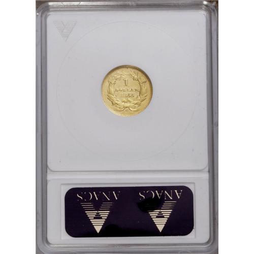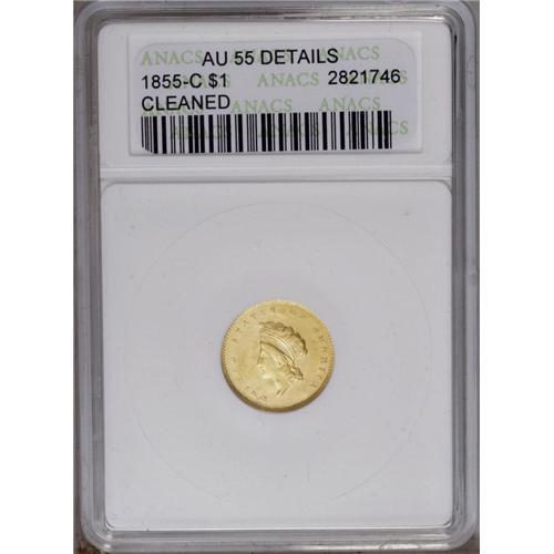 <B>1855-C<G$1>--Cleaned--ANACS. AU55 Details.</B></I> Variety 9-K. Two reverse dies are known for this important issue. On the present piece, the 1 in the date points between the DO in DOLLAR. Another variety has the 1 beneath the right edge of the O. The 1855-C is essential for Charlotte type collectors, as it is the only issue from that mint of the short-lived Type Two design. A bright and lightly hairlined piece that has occasionally micro-granular surfaces. Richly detailed and boldly clashed. Only 9,803 pieces were struck.