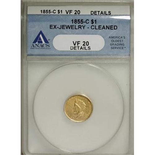 <B>1855-C G$1 --Ex-Jewelry, Cleaned--ANACS. VF20 Details.</B></I> Variety 9-K. A moderately worn lemon-gold survivor from the only Type Two Charlotte gold dollar issue. The unnaturally bright piece shows crimping at the margins, likely from a jewelry mount.<BR><BR><B>Coin Engraver:</B> James B. Longacre<BR><BR><b>Shipping:</b> Coins & Currency (<a target="_blank" href="http://www.heritageauctions.com/common/shipping.php">view shipping information</a>)
