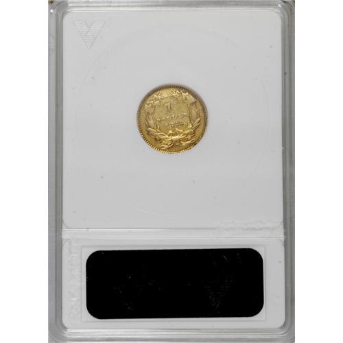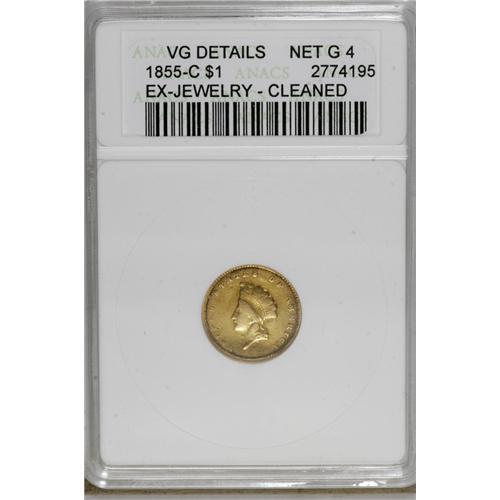 <B>1855-C<G$1>--Ex-Jewelry, Cleaned--ANACS. VG Details, Net Good 4.</B></I> An unnaturally bright, blurry, and slightly wavy piece. The date and mintmark are bold. The second 5 in the date is centered to the right beneath the A in DOLLAR. An affordable example of this rare Charlotte Mint gold type.