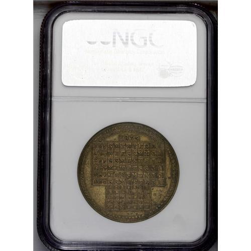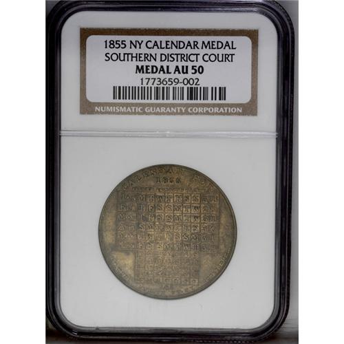 <B>1855 Calendar Medal AU50 NGC.</B></I> Brass. 33mm. Issued by J.B. Hyde of Fulton Street, N.Y.C. Listed by Fuld in April 1958 Numismatist as N.HY.10. Olive-green surfaces display minor handling marks, in addition to moderate translucent lacquer residue between 6 and 9 o'clock on the obverse.<BR><I>From The Troy Wiseman Collection.</B></I>