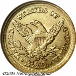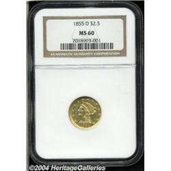<B>1855-D<$2 1/2> MS60 NGC.</B></I> In 1855, the Dahlonega Mint produced a very limited quantity of quarter eagles, just 1,123 coins in all. Just two gold issues of the Dahlonega Mint had lower mintages while a third, the 1861-D gold dollar with mintage unknown, was probably in the same general vicinity with 1,000 to 1,500 estimated. The 1856-D quarter eagle had a lower mintage of 874 coins, while the 1854-D three-dollar gold piece slipped just below this 1855 quarter eagle issue with a mintage of 1,120 examples. Among all Dahlonega Mint gold coins, this issue is near the top for rarity, and probably qualifies as the single rarest quarter eagle. Doug Winter has estimated the total population to be approximately 35 coins and notes that this date is nearly impossible to locate in grades above XF. Winter's Condition Census lists just a single Mint State coin residing in the Smithsonian Institution and not available to collectors today. This example is another, and it is possible that one or two additional pieces have been certified since his reference was published.<BR> This remarkable quarter eagle is quite sharply struck and is more finely detailed than most survivors. The eagle's left (facing) leg and right (facing) claw are poorly defined, however, all other design elements on both sides are quite sharp. The border details are fully visible and all stars have their central radial lines visible. The lustrous light yellow-gold surfaces have a few abrasions and other imperfections, including a couple small dark inclusions on the reverse, no doubt originating with the planchet prior to striking. All of these minor blemishes are expected for a coin at this grade level. The light yellow coloration suggests that this is not totally original, however, very few of the Dahlonega gold coins have survived with original surfaces. All in all, this is an exceptional example that will capture the specialist's attention. <BR><BR><B>Important notice:</B> Heritage usually auctions material at the rate of 200-250 lots per hour. On some occasions eBay Live bid software or the Internet may not be able to keep up with the pace of the auction. We recommend placing a realistic absentee bid now as insurance to avoid disappointment. Occasionally the auctioneer may eliminate or reject an eBay Live bid, and the auctioneer may also reopen a lot after the close of the eBay live bidding (usually because we missed an audience bid), and may reject your bid even if it shows you as the winning bidder. By bidding via eBay Live, you agree that Heritage may award the lot to another bidder at its sole discretion under the circumstances described above or any other reasonable circumstances. Since eBay bids are not shown to us until we open the lot on the floor, we treat those bids just like floor bids. In most cases the floor responds before the eBay bid is presented to us, due to Internet lag time, so for consistency we have made it a policy that floor bids are always considered first over tie eBay live bids. Also please note that all Heritage lots purchased through eBay Live carry a 20% Buyer's Premium. Please make sure you read the Terms and Conditions before you bid. </span></font></tr></table></td></tr></table>