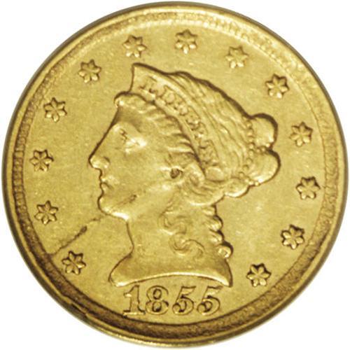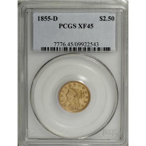 <B>1855-D $2 1/2 XF45 PCGS.</B></I> Variety 18-L. The 1855-D is second in overall rarity and first in condition rarity of the 20 issues in the series of Dahlonega quarter eagles. Only 1,123 pieces were struck. In addition to its status as an absolute rarity, the '55-D is a poorly struck issue, usually seen with heavily abraded surfaces. Only 45-55 pieces are known. This is a pleasing XF coin with one exception: a Mint-made planchet lamination that extends from the obverse rim at 8 o'clock almost to Liberty's ear. Otherwise, the surfaces are free from any distracting marks. The striking details are weak as usual, with die crumbling seen on the denticles on each side.<BR><BR><b>Shipping:</b> Coin/Currency (<a target="_blank" href="http://www.heritageauctions.com/common/shipping.php">view shipping information</a>)