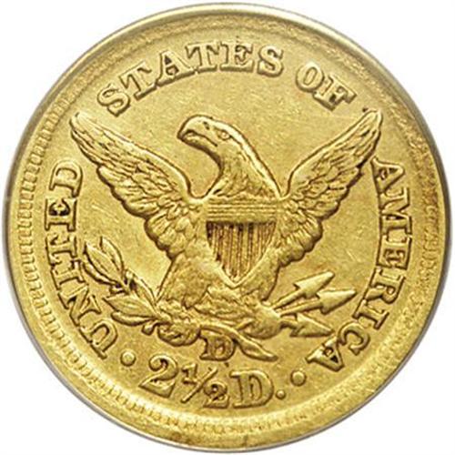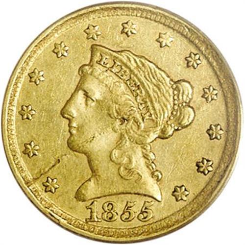 <B>1855-D<$2 1/2> XF45 PCGS.</B></I> Variety 18-L. The 1855-D is second in overall rarity and first in condition rarity of the 20 issues in the series of Dahlonega quarter eagles. Only 1,123 pieces were struck, and in addition to being an absolute rarity, the '55-D is also a poorly struck issue that is usually seen with heavily abraded surfaces. Only 45-55 pieces are known. This is a pleasing XF coin with one exception: a Mint-made planchet lamination that extends from the obverse rim at 8 o'clock almost to Liberty's ear. Otherwise, the surfaces are free from any distracting marks. The striking details are weak as usual with die crumbling seen on the denticles on each side.