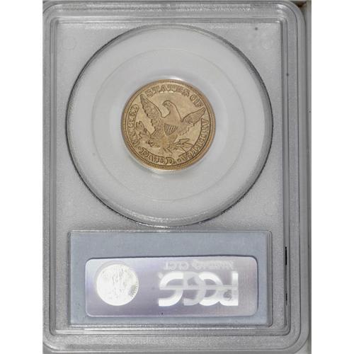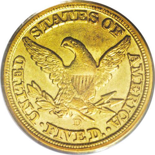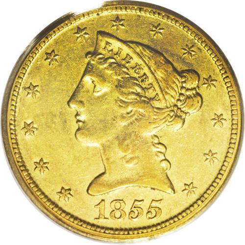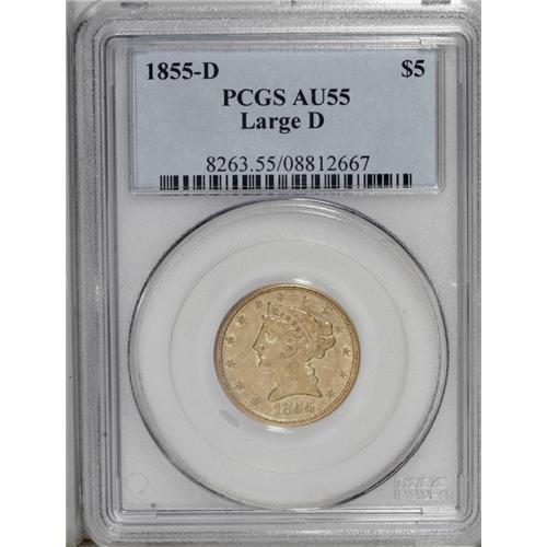 <B>1855-D<$5> Large D AU55 PCGS.</B></I> Variety 32-AA. The 1855-D is a formidable rarity in Mint State. PCGS has certified only two pieces above the AU58 level. Thus, even advanced collectors must settle for an attractive AU example. This smooth yellow-gold piece is softly defined on the eagle's neck and the curl beneath the ear, but remaining design elements are sharp. Just 22,432 pieces were struck. Population: 7 in 55, 11 finer (8/06).