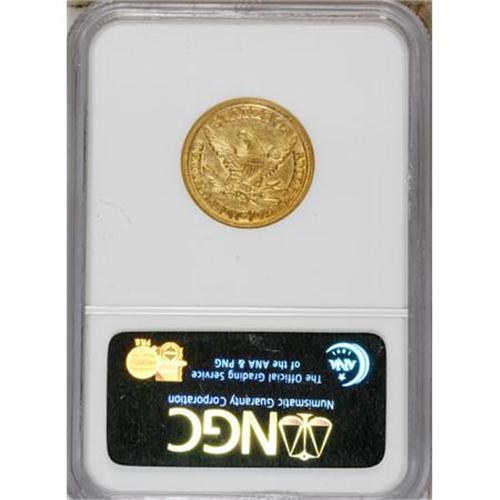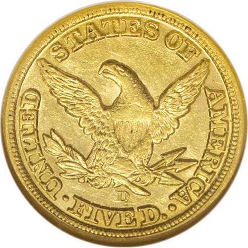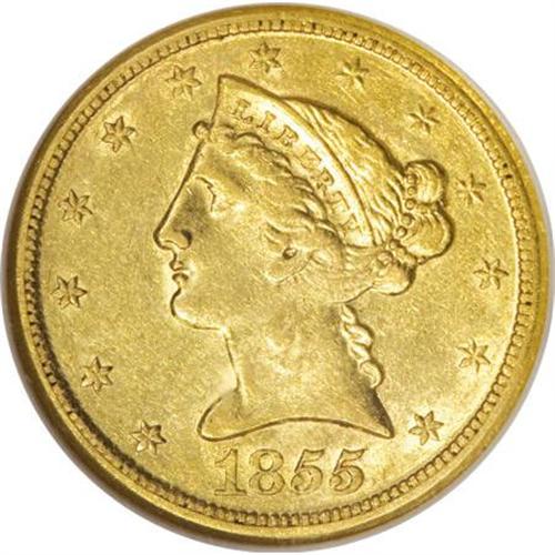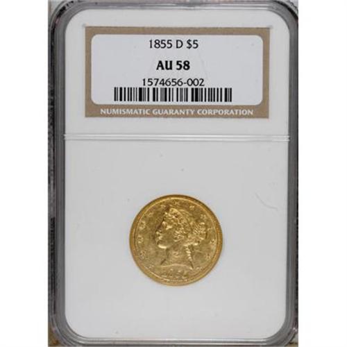 <B>1855-D $5 Large D AU58 NGC.</B></I> Variety 32-AA. Once the San Francisco Mint reached full operation, mintages of half eagles at Dahlonega dwindled rapidly. Only 22,432 pieces were struck in 1855, a sizeable drop-off from the 89,678 pieces struck just two years before. Most certified survivors are in XF and AU grades, with only a handful of Mint State pieces known. This clean example has noticeable luster and smooth surfaces. Well struck near the borders with typical definition on the eagle's neck and the curl below the ear. Census: 17 in 58, 6 finer (5/07).<BR><BR><b>Shipping:</b> Coins & Currency (<a target="_blank" href="http://www.heritageauctions.com/common/shipping.php">view shipping information</a>)