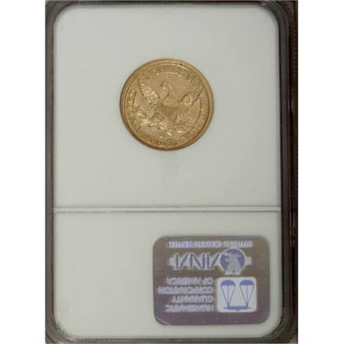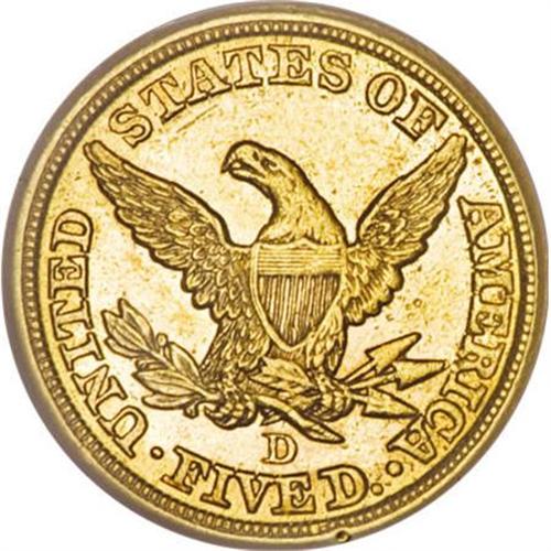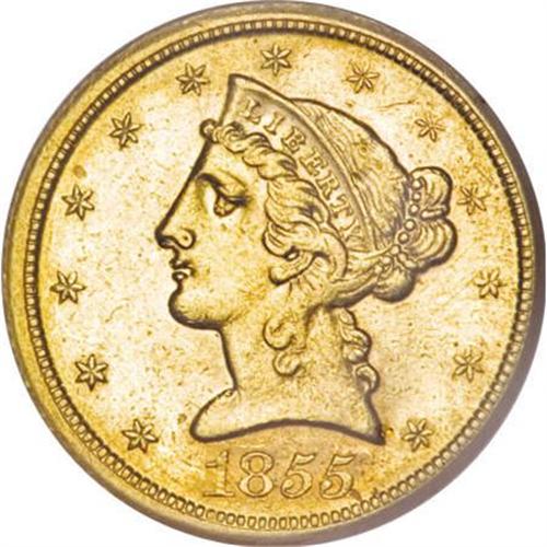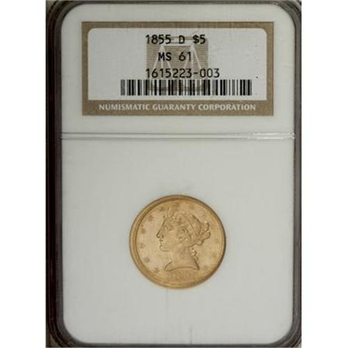 <B>1855-D $5 Large D MS61 NGC.</B></I> Variety 32-AA, identified according to Douglas Winter in <I>The Gold Coins of the Dahlonega Mint, 1838-1861</B></I> by the upright of the mintmark over the gap between the V and E in FIVE, and away from the stem and well below the feather.<BR> The 1855-D is extremely rare in Mint State. Winter estimates four to five extant Uncirculated coins. NGC and PCGS have certified eight specimens, five of which are MS61, and one each in MS62, MS63, and MS64.<BR> The yellow-gold surfaces of this MS61 example display relatively well struck design elements, save for softness on the eagle's neck feathers, this being typical for the issue. The most potent luster resides in the recesses, and each side reveals a more or less equal distribution of light to moderate contact marks. This may well be considered a special offering, as one seeking a Mint State example is unlikely to locate one finer!<BR><BR><B>Coin Engraver:</B> Christian Gobrecht<BR><BR><b>Shipping:</b> Coins & Currency (<a target="_blank" href="http://www.heritageauctions.com/common/shipping.php">view shipping information</a>)