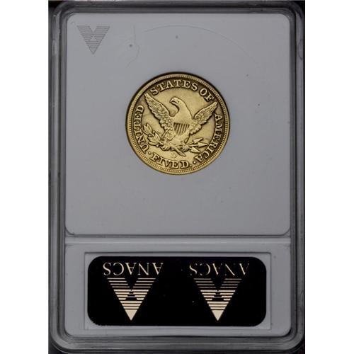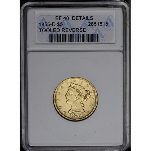 <B>1855-D<$5> Large D--Tooled Reverse--ANACS. XF40 Details.</B></I> Variety 32-AA. A bright and softly struck piece with a series of wispy marks above the eagle's left (facing) shoulder. Mintages of half eagles at Dahlonega dwindled rapidly after 1853, since newly mined Western gold was sent to the new San Francisco Mint rather than to Eastern facilities for coinage.
