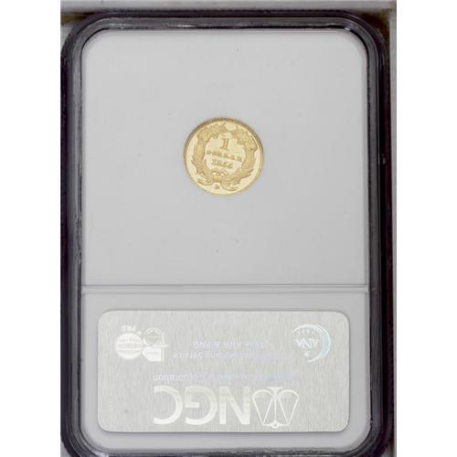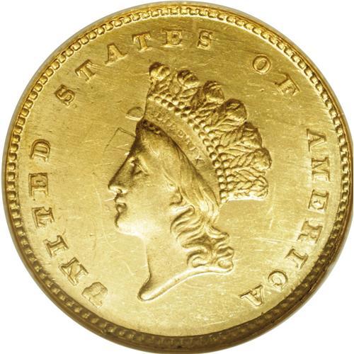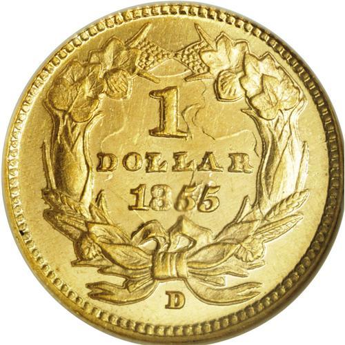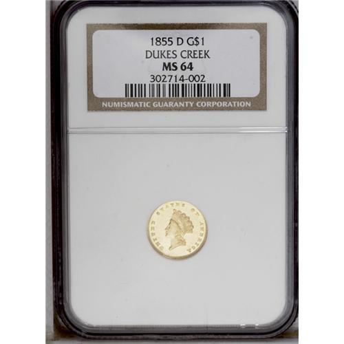<B>1855-D<G$1> MS64 NGC.</B></I> Variety 7-I. The second 5 in the date is positioned completely beneath the A in DOLLAR. An early die state with a remarkable full date and a coin that lacks the die crack to the right of the mintmark seen on later die states.<BR> 1855-D gold dollars with a full date are extremely rare as such with no more than nine or 10 pieces known. The Duke's Creek example is the finest of these, and its sharpness of strike is easily the best seen on any 1855-D.<BR> The 1855-D is the second rarest Dahlonega gold dollar in terms of its overall rarity, but it is clearly the rarest in high grades. Of the 1,811 pieces produced, there are probably no more than 75-90 examples known. Four coins are extant that would qualify as Uncirculated by today's standards. This piece is clearly the finest, and it is one of just two Mint State pieces with a full date. A strong case can be made for calling this coin one of the two most desirable Dahlonega gold dollars in existence, along with the Duke's Creek 1861-D offered below.<BR> As mentioned above, this issue is plagued by weakness of strike. Nearly every known 1855-D shows considerable weakness on the 8 in the date, and sometimes on the first 5. Specialists have long regarded full date examples as rare and desirable, and in the past decade those with sharper dates have traded at premium prices over those with typical weak dates. The present example has a remarkably bold date. It is almost fully detailed on both the obverse and reverse, despite the fact that there are clash marks on each side. It is ironic, and appropriate, that the finest known 1855-D gold dollar is also the best struck.<BR> The surfaces are clean, with just a few fine hairlines (not from cleaning) in the fields. Under magnification, there is some slight roughness, as made. The above-mentioned clash marks are most noticeable at Liberty's forehead and in front of the face; the reverse has some rather extensive and interesting clash mark patterns in the center.<BR> Another amazing feature of this coin's appearance is its luster. Most 1855-D gold dollars are worn to the point that no luster is visible, and on the few higher grade pieces that are known, the luster is typically dull and flat. This piece has bright, frosty luster, with a texture more like a Philadelphia Type Two gold dollar than one from Dahlonega. The coloration is a light yellow-gold, with some greenish tinges.<BR> This is a truly remarkable coin that is certainly one of the highlights of the Duke's Creek Collection. We have been fortunate to sell many of the Condition Census examples of this date over the past few years. In the Platinum Night session of the January 2006 FUN Sale, the second finest known 1855-D gold dollar, graded MS64 by NGC, brought $109,250. While that coin was certainly a lovely example, it lacked a full date and, in our opinion, is therefore not as desirable as this piece. We expect the Duke's Creek 1855-D to set a record price for this date.<BR><I>Ex: Manfra, Tordella and Brookes via private treaty to Harry Bass in December 1974; Harry Bass Collection (Bowers and Merena, 10/99), lot 102, where it brought $92,000; Hancock and Harwell.</B></I><BR><I>From The Duke's Creek Collection of Dahlonega Gold.</B></I>