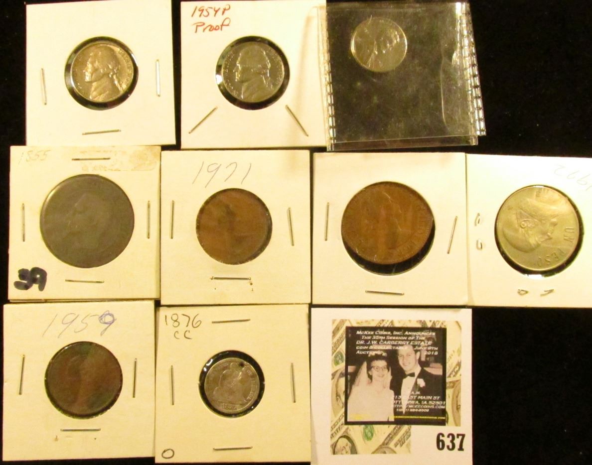 1855 France 10c; 1943D Cent; 1954 P Proof & 62D EF Nickels; (2) British Coins, (2) Mexican Coins, &