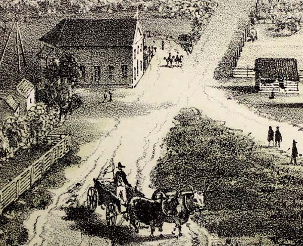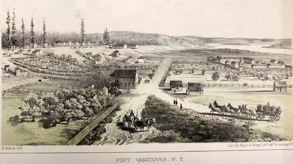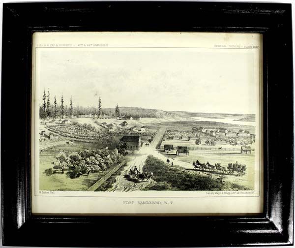 1855 Fort Vancouver Washington Territory Lithograph, Pacific Railroad Survey U.S.P.R.R. Exp. & Surveys - 47th & 49th Parallels, General Report Plate XLIV, G. Schon Del. Sarony Major & Knapp Lith, 449 Broadway NY, framed and under glass, visual measures 7.5'' x 9.5''