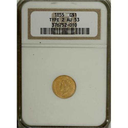 <B>1855 G$1 AU53 NGC.</B></I> Traces of luster reside in the recesses of this suitably struck apricot-gold dollar. Some minute contact marks are noted on the obverse, and heavy clash marks are visible on each side.<BR><I>From The Southwest Collection.</B></I><BR><BR><B>Coin Engraver:</B> James B. Longacre<BR><BR><b>Shipping:</b> Coins & Currency (<a target="_blank" href="http://www.heritageauctions.com/common/shipping.php">view shipping information</a>)