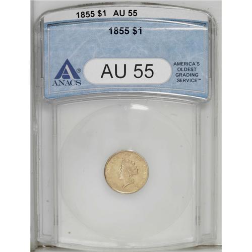 1855 G$1 AU55 ANACS. A charming honey-gold example of