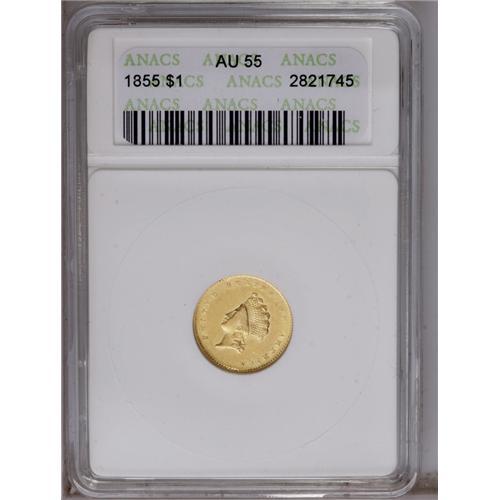 1855 G$1 AU55 ANACS. A smooth, lightly circulated exam 1855[G$1] AU55 ANACS.