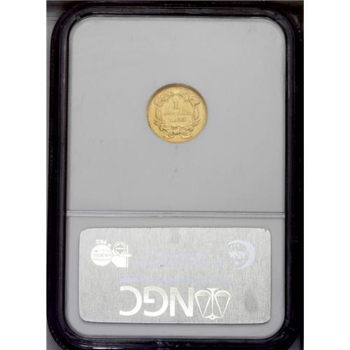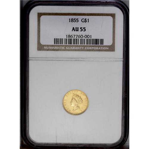 <B>1855<G$1> AU55 NGC.</B></I> Minor wear blends with the soft strike often found on this issue. The antique-gold surfaces are still lustrous, though they display some handling marks.