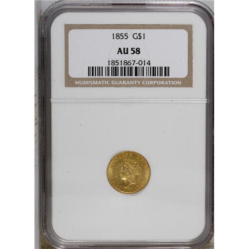 1855 G$1 AU58 NGC. Ample original luster remains on th