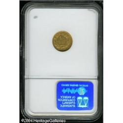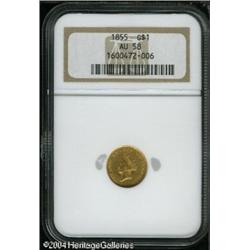 1855 G$1 AU58 NGC. An original golden-brown type c <B>1855 G$1 AU58 NGC.</B></I> An original golden-brown type coin with noticeable bright luster and scant highpoint friction. The central reverse has a couple of light pinscratches. Type Two Gold Dollars are scarce and always in demand for gold type sets. <BR><BR><B>Important notice:</B> Heritage usually auctions material at the rate of 200-250 lots per hour. On some occasions eBay Live bid software or the Internet may not be able to keep up with the pace of the auction. We recommend placing a realistic absentee bid now as insurance to avoid disappointment. Occasionally the auctioneer may eliminate or reject an eBay Live bid, and the auctioneer may also reopen a lot after the close of the eBay live bidding (usually because we missed an audience bid), and may reject your bid even if it shows you as the winning bidder. By bidding via eBay Live, you agree that Heritage may award the lot to another bidder at its sole discretion under the circumstances described above or any other reasonable circumstances. Since eBay bids are not shown to us until we open the lot on the floor, we treat those bids just like floor bids. In most cases the floor responds before the eBay bid is presented to us, due to Internet lag time, so for consistency we have made it a policy that floor bids are always considered first over tie eBay live bids. Also please note that all Heritage lots purchased through eBay Live carry a 20% Buyer's Premium. Please make sure you read the Terms and Conditions before you bid. This lot is being auctioned in conjunction with a live floor auction by Heritage Galleries & Auctioneers. All final auction and invoice information will be supplied by Heritage Galleries & Auctioneers, and all other information should be considered preliminary. Lot:6455