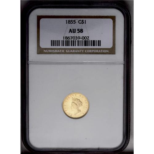 <B>1855<G$1> AU58 NGC.</B></I> Lightly struck through the centers with weakness noted on LL in DOLLAR, but mostly free of distracting abrasions and with pretty honey-gold surfaces.