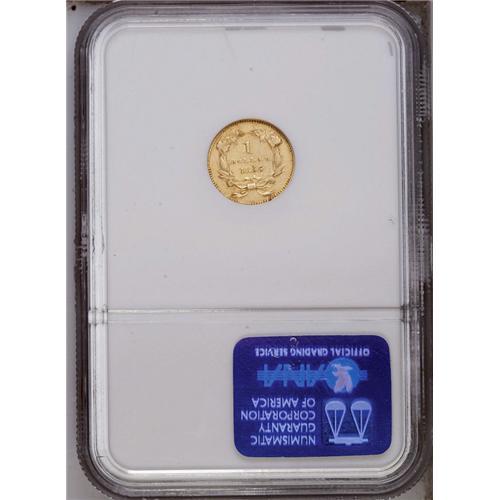 <B>1855<G$1> AU58 NGC.</B></I> Lightly worn with substantial luster and pleasing green-gold coloration. Die clash marks, a curly lintmark (as struck), and wispy hairlines are noted on the reverse.