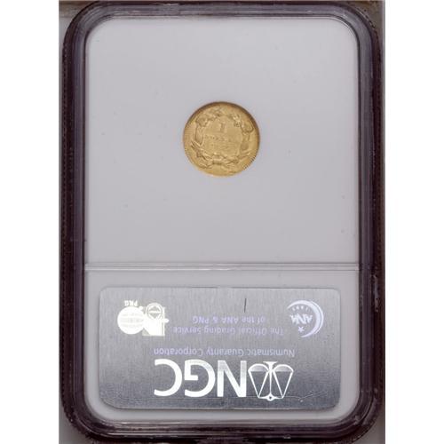 <B>1855 G$1 AU58 NGC.</B></I> Luster illuminates the legends and devices. A near-Mint straw-gold example of this elusive type. A wispy hair-thin mark reaches the nose, but generally smooth.