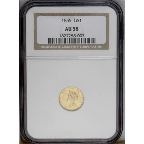 <B>1855 G$1 AU58 NGC.</B></I> Moderate die clashing is visible on the reverse, but this attractive near-Mint State example is largely problem-free, save for the expected strike weakness. In this case the strike is weak on IC on the obverse, and on the reverse through the date and the R of DOLLAR. The color is a moderate yellow-gold with gray tinges, and there are few abrasions. A good choice to represent the short-lived Type Two coinage.