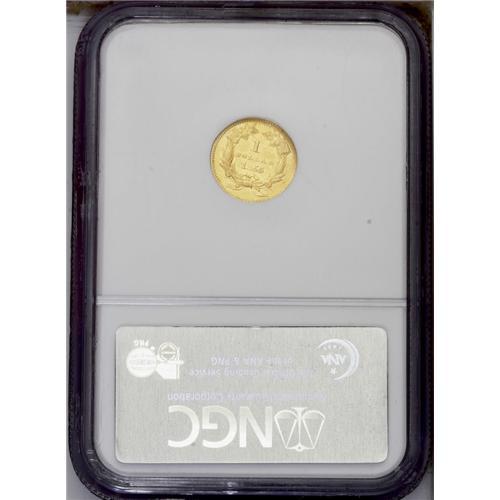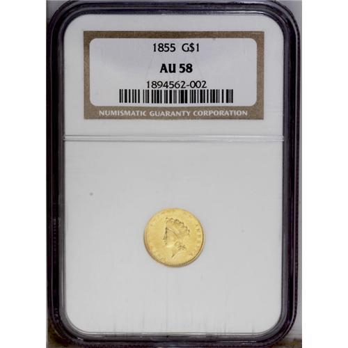 <B>1855<G$1> AU58 NGC.</B></I> Nearly full luster is visible on both sides with bright greenish-gold color. Excellent eye appeal. This is a highly desirable example for most any collector. Light clash marks are noted on the reverse, and both sides have the usual central design weakness. <BR><BR><B>Important notice:</B> Heritage usually auctions material at the rate of 200-250 lots per hour. On some occasions eBay Live bid software or the Internet may not be able to keep up with the pace of the auction. We recommend placing a realistic absentee bid now as insurance to avoid disappointment. Occasionally the auctioneer may eliminate or reject an eBay Live bid, and the auctioneer may also reopen a lot after the close of the eBay live bidding (usually because we missed an audience bid), and may reject your bid even if it shows you as the winning bidder. By bidding via eBay Live, you agree that Heritage may award the lot to another bidder at its sole discretion under the circumstances described above or any other reasonable circumstances. Since eBay bids are not shown to us until we open the lot on the floor, we treat those bids just like floor bids. In most cases the floor responds before the eBay bid is presented to us, due to Internet lag time, so for consistency we have made it a policy that floor bids are always considered first over tie eBay live bids. Also please note that all Heritage lots purchased through eBay Live carry a 20% Buyer's Premium. Please make sure you read the Terms and Conditions before you bid. This lot is being auctioned in conjunction with a live floor auction by Heritage Galleries & Auctioneers. All final auction and invoice information will be supplied by Heritage Galleries & Auctioneers, and all other information should be considered preliminary. Lot:2280 <BR><BR><B>Winning Notification and Billing:</B> After the FINAL session in this auction is complete, Heritage will send e-mail and snail mail invoices. This process normally takes several days. All final auction and invoice information will be supplied by Heritage Galleries & Auctioneers, and all other information should be considered preliminary. <BR><BR>This auction will be conducted on a live auction floor and over the Internet through eBay Live. If you choose to place an absentee bid, please take a moment to <font color='#0000ff'><u><a href='http://pages.ebay.com/liveauctions/help/before/laabsentee.html'>learn how eBay Live absentee bidding works</a></u></font><font color='#000000'>