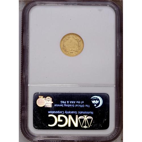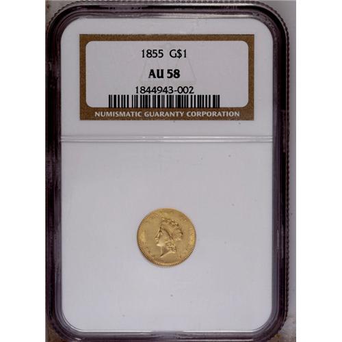 <B>1855 G$1 AU58 NGC.</B></I> Satiny textured surfaces with pleasing color for this conditionally elusive type. There is noticeable die clashing on each side and weakness in the 8 of the date.