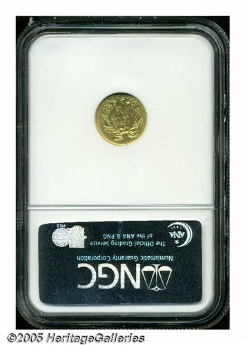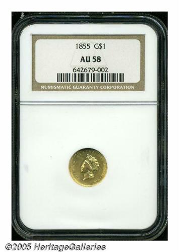 <B>1855<G$1> AU58 NGC.</B></I> Second year of the short-lived Type Two gold dollar. This lightly circulated piece is well defined, save for softness in portions of Liberty's hair. Nice luster is retained on the yellow-gold surfaces. Relatively well preserved, with just a couple of minor contact marks on Liberty's cheek and in the left (facing) obverse field.