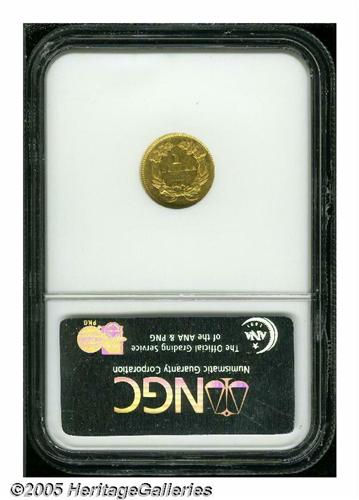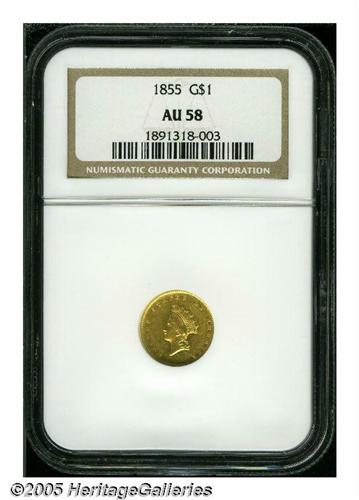 <B>1855<G$1> AU58 NGC.</B></I> Second year of the short-lived Type Two design. Well struck with even, light coloration, a slight degree of highpoint wear, and unabraded surfaces that have some faint hairlines in the obverse and reverse fields. A fair amount of luster remains.