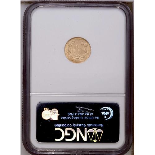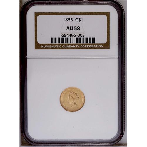 <B>1855<G$1> AU58 NGC.</B></I> The surfaces display peach-gold patina and traces of luster in the protected areas. A relatively nice, even strike prevails over both sides. A few minor obverse marks do not distract. <BR><BR><B>Important notice:</B> Heritage usually auctions material at the rate of 200-250 lots per hour. On some occasions eBay Live bid software or the Internet may not be able to keep up with the pace of the auction. We recommend placing a realistic absentee bid now as insurance to avoid disappointment. Occasionally the auctioneer may eliminate or reject an eBay Live bid, and the auctioneer may also reopen a lot after the close of the eBay live bidding (usually because we missed an audience bid), and may reject your bid even if it shows you as the winning bidder. By bidding via eBay Live, you agree that Heritage may award the lot to another bidder at its sole discretion under the circumstances described above or any other reasonable circumstances. Since eBay bids are not shown to us until we open the lot on the floor, we treat those bids just like floor bids. In most cases the floor responds before the eBay bid is presented to us, due to Internet lag time, so for consistency we have made it a policy that floor bids are always considered first over tie eBay live bids. Also please note that all Heritage lots purchased through eBay Live carry a 20% Buyer's Premium. Please make sure you read the Terms and Conditions before you bid. This lot is being auctioned in conjunction with a live floor auction by Heritage Galleries & Auctioneers. All final auction and invoice information will be supplied by Heritage Galleries & Auctioneers, and all other information should be considered preliminary. Lot:2277 <BR><BR><B>Winning Notification and Billing:</B> After the FINAL session in this auction is complete, Heritage will send e-mail and snail mail invoices. This process normally takes several days. All final auction and invoice information will be supplied by Heritage Galleries & Auctioneers, and all other information should be considered preliminary. <BR><BR>This auction will be conducted on a live auction floor and over the Internet through eBay Live. If you choose to place an absentee bid, please take a moment to <font color='#0000ff'><u><a href='http://pages.ebay.com/liveauctions/help/before/laabsentee.html'>learn how eBay Live absentee bidding works</a></u></font><font color='#000000'>