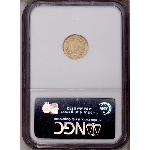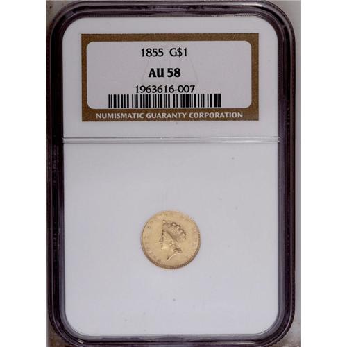 <B>1855 G$1 AU58 NGC.</B></I> Yellow-gold surfaces retain considerable luster and exhibit sharply defined motifs, including clarity on LIBERTY. Minute contact marks occur on Liberty's cheek.