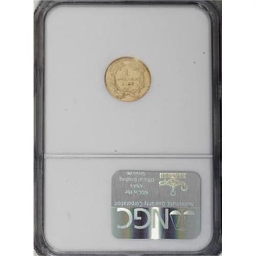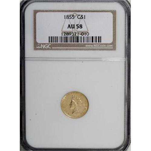 <B>1855 G$1 AU58 NGC.</B></I> Bright brassy-gold surfaces reveal considerable luster, and a well executed strike imparts good definition on the design elements, save for the usual softness on the top of the 8 in the date. the normal assortment of marks are noted. The reverse is clashmarked.<BR><BR><b>Shipping:</b> Coins & Currency (<a target="_blank" href="http://www.heritageauctions.com/common/shipping.php">view shipping information</a>)