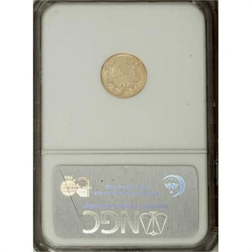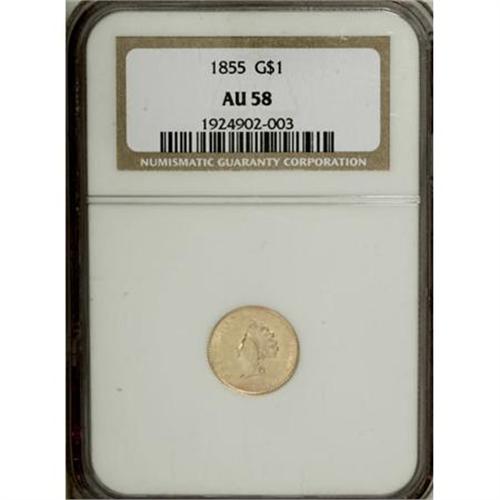 <B>1855 G$1 AU58 NGC.</B></I> Brassy-gold surfaces retain a good amount of luster, and exhibit sharply struck design elements. A few wispy circulation marks are visible on each side.<BR><BR><B>Coin Engraver:</B> James B. Longacre<BR><BR><b>Shipping:</b> Coins & Currency (<a target="_blank" href="http://www.heritageauctions.com/common/shipping.php">view shipping information</a>\)