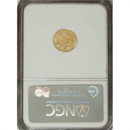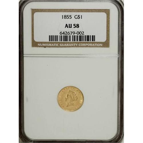 <B>1855 G$1 AU58 NGC.</B></I> Second year of the short-lived Type Two gold dollar. This lightly circulated piece is well defined, save for softness in portions of Liberty's hair. Nice luster is retained on the yellow-gold surfaces. Relatively well preserved, with just a few minor contact marks and pinscratches in the left (facing) obverse field.<BR><BR><B>Coin Engraver:</B> James B. Longacre<BR><BR><b>Shipping:</b> Coins & Currency (<a target="_blank" href="http://www.heritageauctions.com/common/shipping.php">view shipping information</a>)