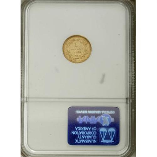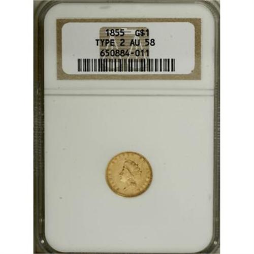 <B>1855 G$1 AU58 NGC.</B></I> This is an attractive piece with pleasing coloration and abrasion-free surfaces that just show faint hairlines in the fields and even highpoint wear on the devices. Typical moderate clash marks are noted on the reverse. A desirable near-Mint example of the Type Two gold dollar.<BR><I>From The Casa Becca del Norté Collection.</B></I><BR><BR><B>Coin Engraver:</B> James B. Longacre<BR><BR><b>Shipping:</b> Coins & Currency (<a target="_blank" href="http://www.heritageauctions.com/common/shipping.php">view shipping information</a>)