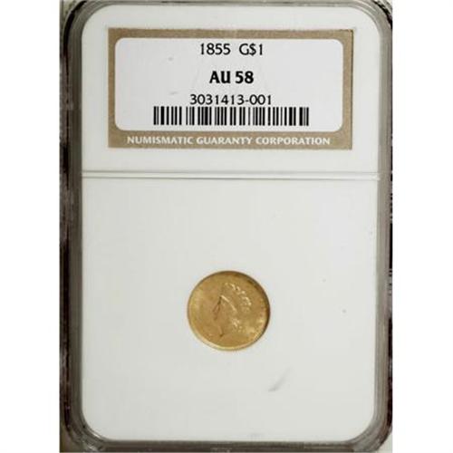 <B>1855 G$1 AU58 NGC.</B></I> NGC Census: (1640/1294). PCGS Population (409/1175). Mintage: 758,269. Numismedia Wsl. Price for NGC/PCGS coin in AU58: $1,050. (#7532)<BR><BR><B>Coin Engraver:</B> James B. Longacre<BR><BR><b>Shipping:</b> Coins & Currency (<a target="_blank" href="http://www.heritageauctions.com/common/shipping.php">view shipping information</a>)