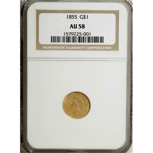 <B>1855 G$1 AU58 NGC.</B></I> NGC Census: (1640/1294). PCGS Population (409/1175). Mintage: 758,269. Numismedia Wsl. Price for NGC/PCGS coin in AU58: $1,050. (#7532)<BR><BR><B>Coin Engraver:</B> James B. Longacre<BR><BR><b>Shipping:</b> Coins & Currency (<a target="_blank" href="http://www.heritageauctions.com/common/shipping.php">view shipping information</a>)