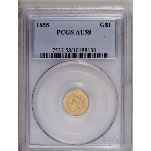 <B>1855<G$1> AU58 PCGS.</B></I> A trace of friction keeps this still-lustrous and appealing piece from Mint State. The gold-orange surfaces have a streaky appearance on the reverse.