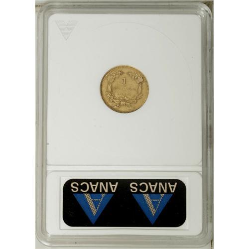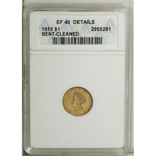 <B>1855 G$1 --Bent, Cleaned--ANACS. XF40 Details.</B></I> NGC Census: (64/7990). PCGS Population (142/2652). Mintage: 758,269. Numismedia Wsl. Price for NGC/PCGS coin in XF40: $442. (#7532)<BR><BR><b>Shipping:</b> Coins & Currency (<a target="_blank" href="http://www.heritageauctions.com/common/shipping.php">view shipping information</a>)