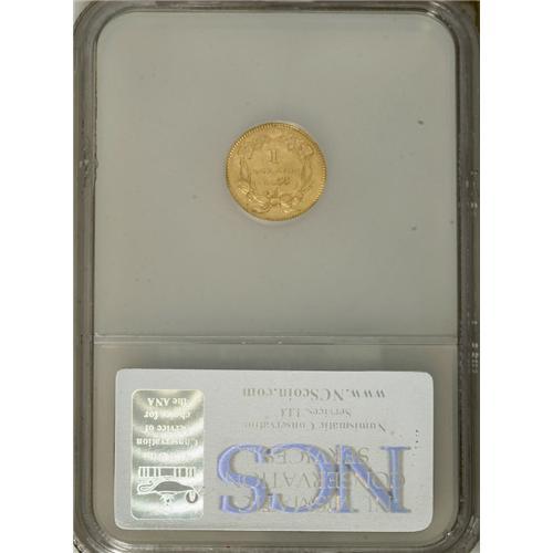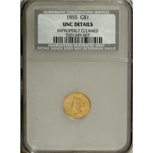 <B>1855 G$1 --Improperly Cleaned--NCS. Unc Details.</B></I> A well struck butter-yellow example with subdued luster and lightly hairlined surfaces. Light clash marks appear on each side. The 1855 Type Two gold dollar was one of four issues for the denomination that year, though the others are considerably more elusive and less suitable for type collectors.<BR><BR><b>Shipping:</b> Coins & Currency (<a target="_blank" href="http://www.heritageauctions.com/common/shipping.php">view shipping information</a>)