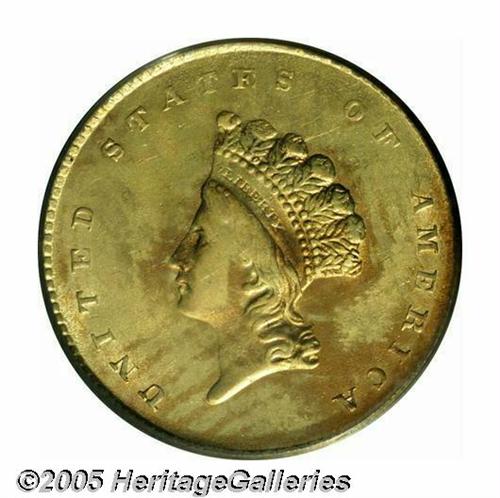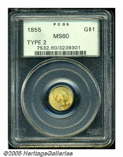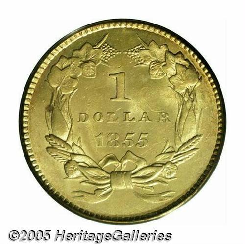 <B>1855<G$1> MS60 PCGS.</B></I> Second and final year of the Type Two design, this is an uncommonly lustrous coin for the grade. Both sides have a layer of reddish-golden coloration with an occasional accent of lilac on the obverse. Better struck than most, the surfaces display numerous small abrasions, as one would expect from a coin in this grade.<BR><I>From The Empire State Collection.</B></I>