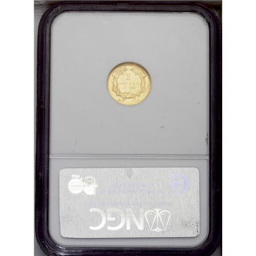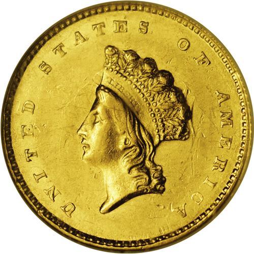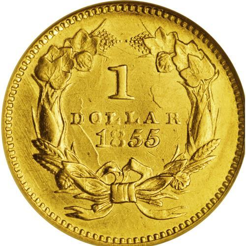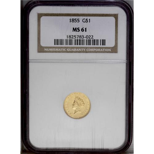 1855 G$1 MS61 NGC. Typically struck with the usual die